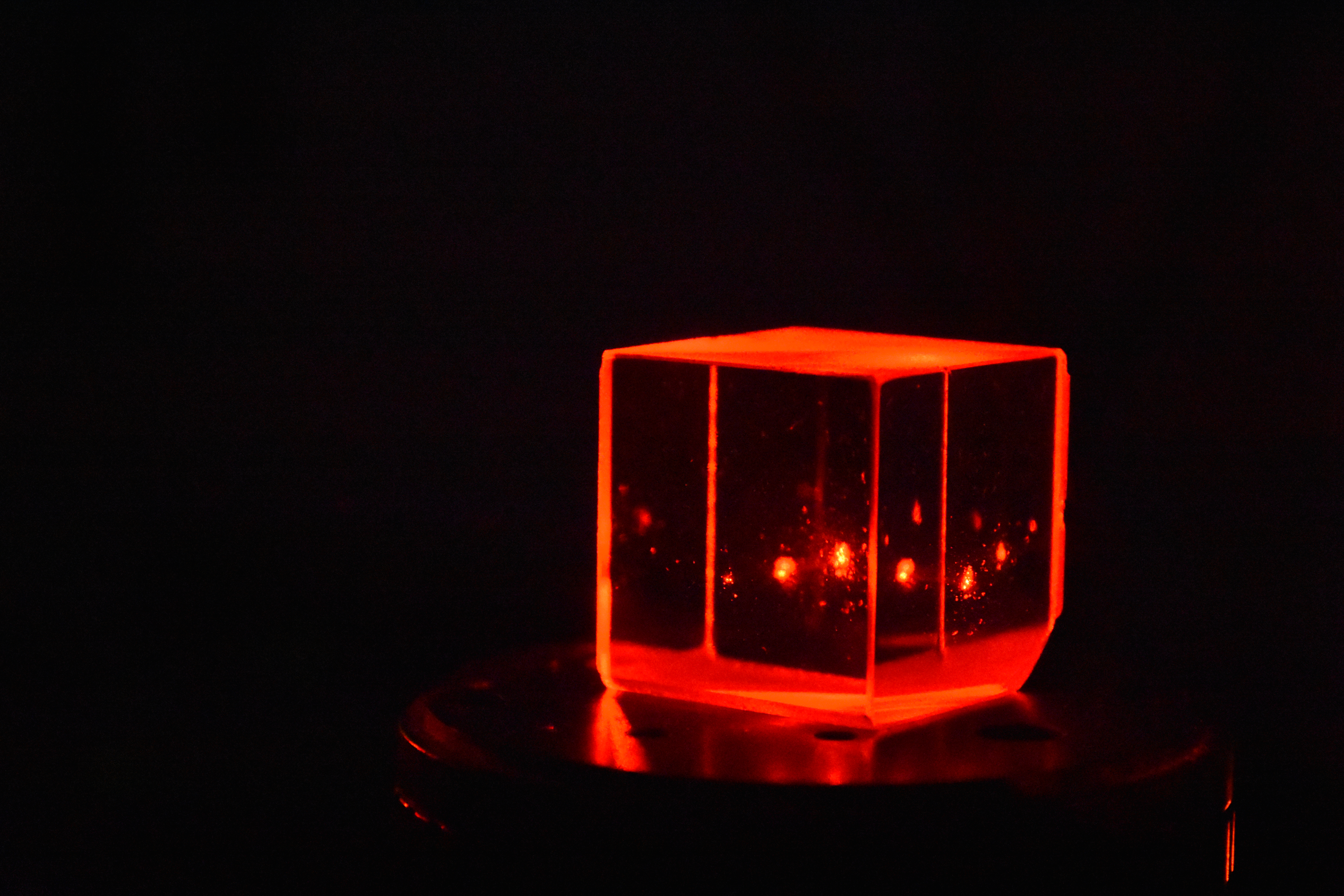 Beamsplitter cube illuminated by a red Helium Neon Laser (wavelength 633 nm)
