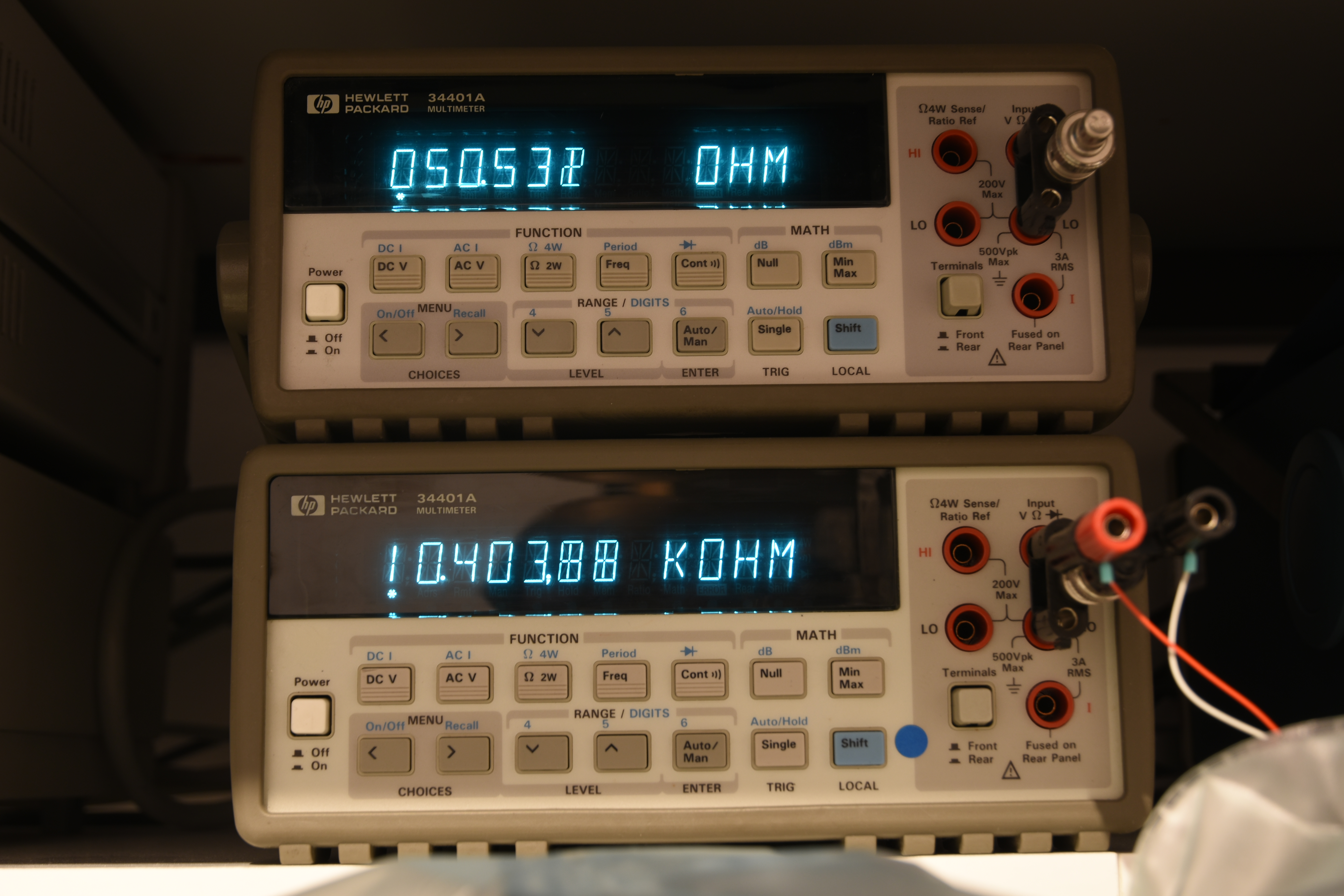 Just a test photograph. Both DMMs are measuring the resistance. Top DMM: 50 Ohm, bottom DMM: 10k Ohm NTC (temperature sensitive resistor)