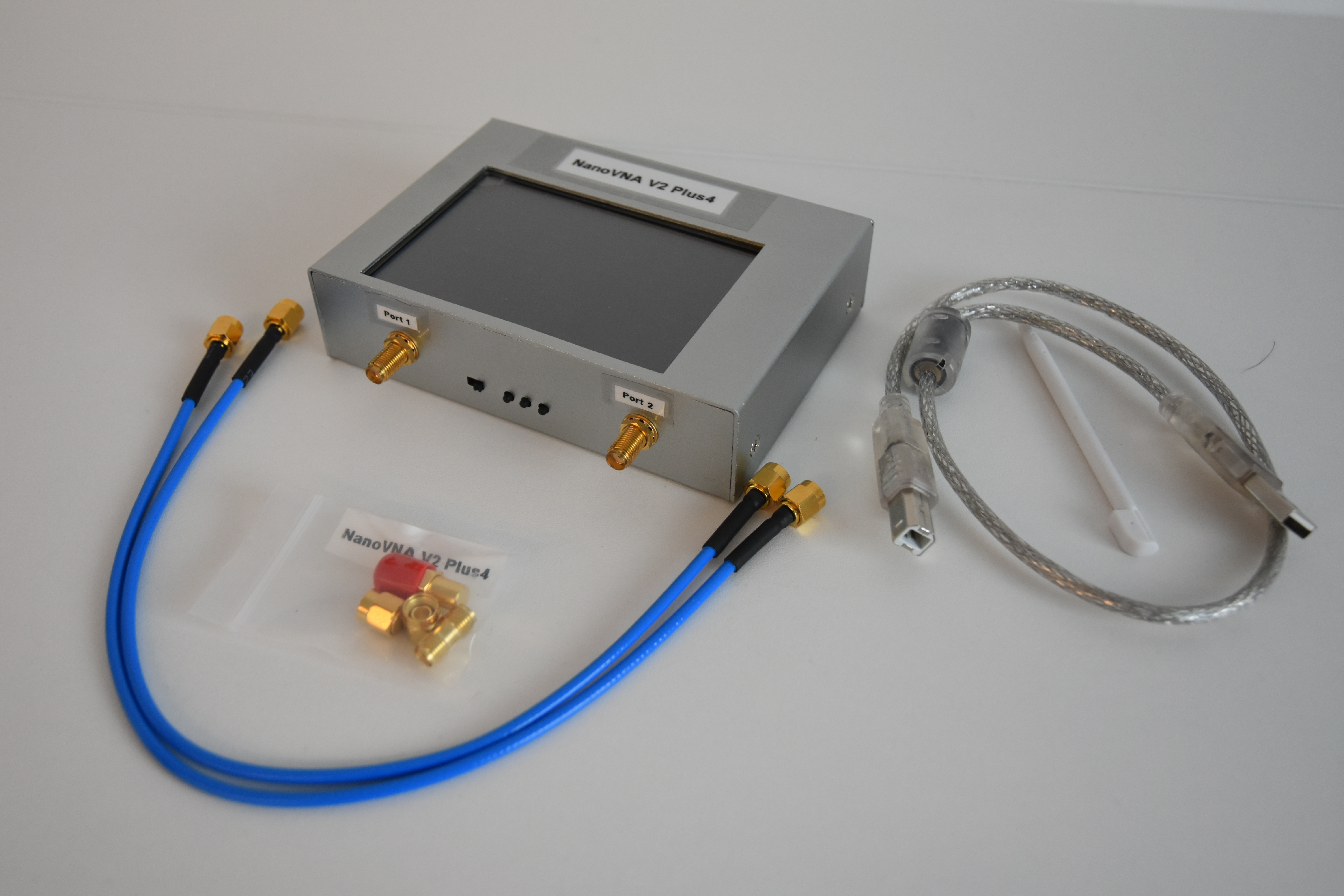 NanoVNA V2 Plus4 with additional accessories: two SMA cables, S-O-L-T calibration set, USB cable, stylus for the touchscreen